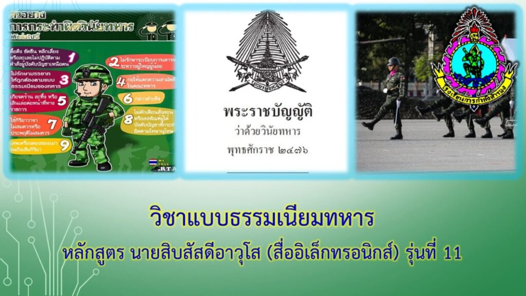 วิชาแบบธรรมเนียมทหาร B สื่อประกอบการเรียนการสอน 1. กล่าวนำ 2. การแต่งกายของทหาร 3.การแสดงความเคารพ 4. การรายงาน ใบงาน (ไม่มี) แบบทดสอบประเมินผล https://forms.gle/iLhN4MugjppMd1Ra8